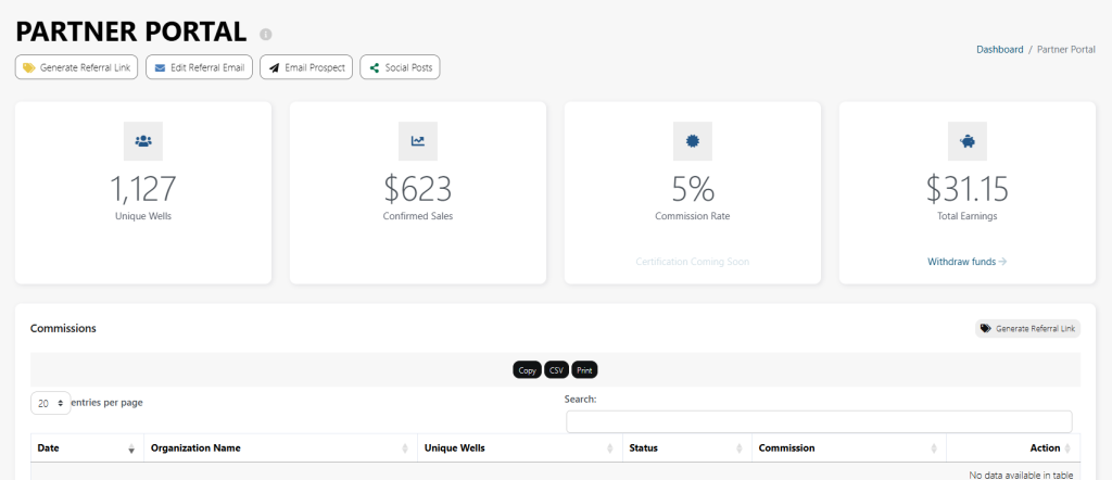 From the Partner Portal dashboard, you have access to the number of active users who have signed-up, the dollar value of the sales your referral link has generated, your commission rate, and the total about of un-withdrawn funds.