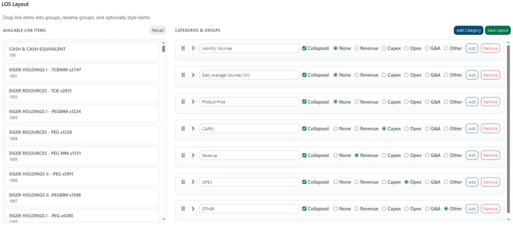 - Use Categories for the high-level LOS sections (Revenue, NET REVENUE, CAPEX, OPEX).