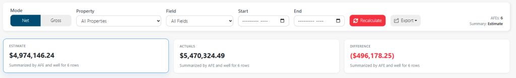 Overview of the Budget vs Actual summary: top-line clickable chips for Estimate, Actuals, and Difference and how to navigate to AFE / Well details.