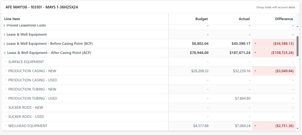The Budget vs Actual — Detail View shows budget and actual information for a selected AFE / well, with collapsible category groups, per-line variance and variance %, and drilldown to the underlying transactions and invoices. Use this page to investigate over/under spends, review account-level detail, and export AFE-level reports.